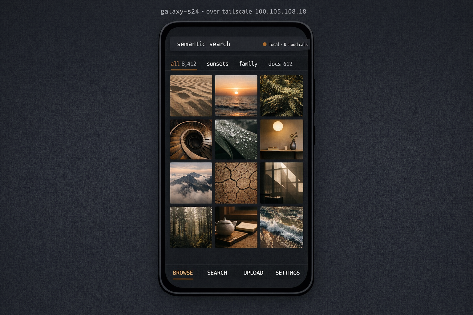 Albums replaces that pair with a small box in my closet. The phone uploads to it over Tailscale, the box runs the indexes, the mobile app browses everything, and I keep the originals — and the captions, and the embeddings, and the audit log of what was ingested when.