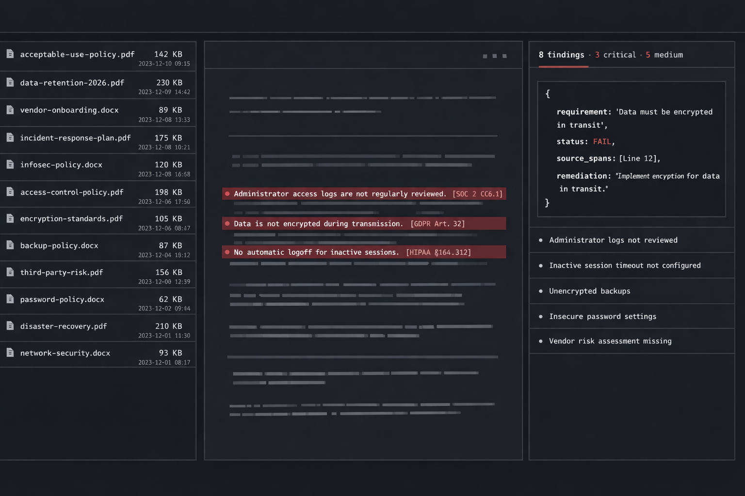 | Frameworks | SOC 2 · GDPR · HIPAA | 62 requirements, hand-curated, verbatim |