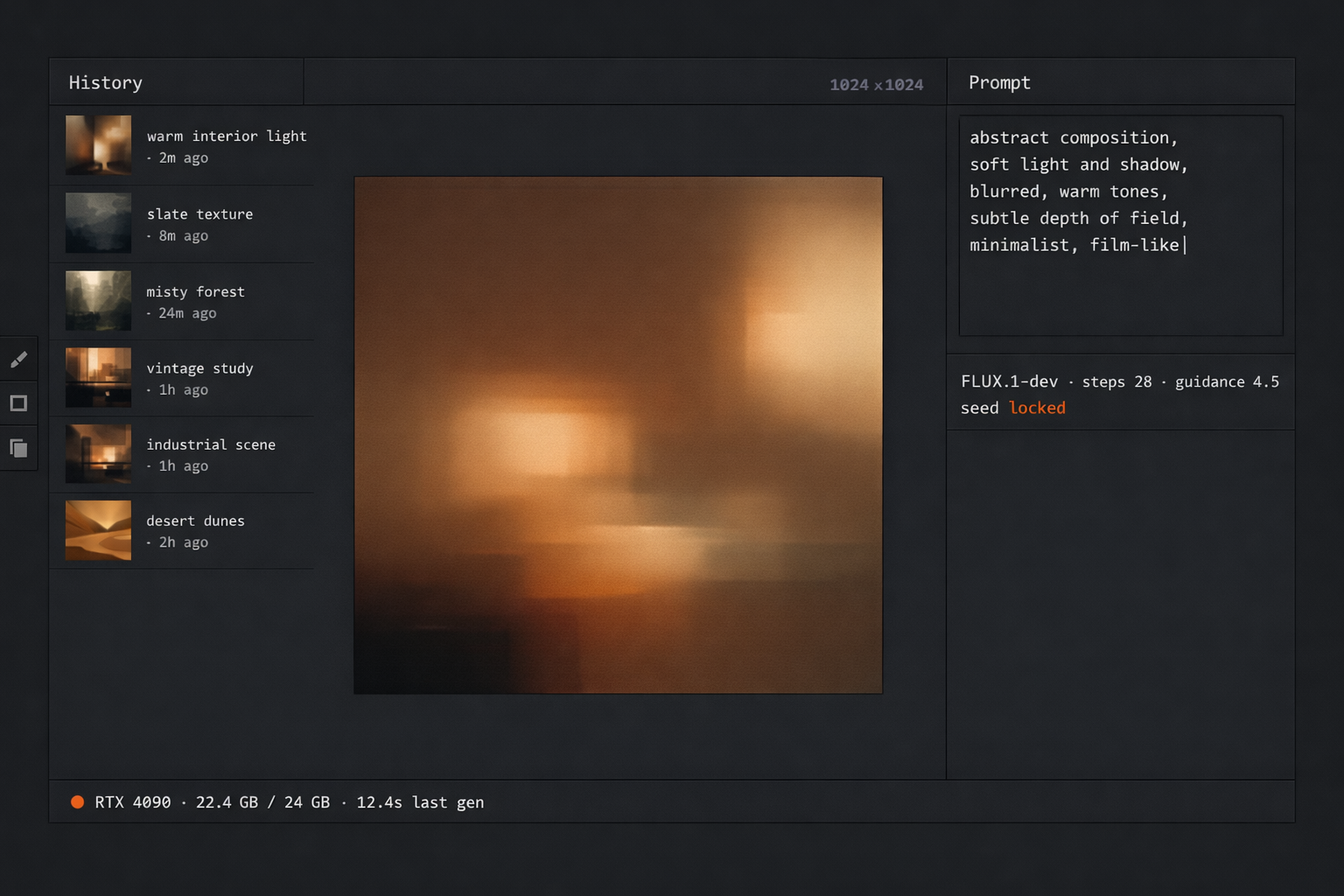 FLUX.1-dev as the headline model. Slower than Turbo, larger than SDXL, fussier on prompts — but the only one that holds up at 1024×1536 portrait without a refinement pass. The base model has to be the best one I can run; everything else builds on it.